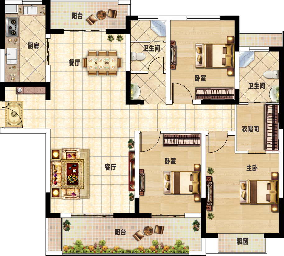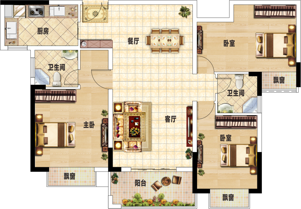 三飘窗,阔景阳台,充足采光; 双卫设计,独立空间; L型厨房,让烹饪更加自如