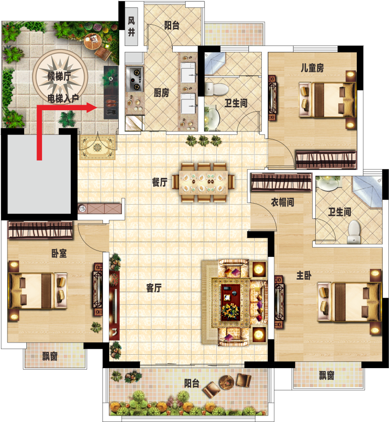 L型入户玄关 动静分区、独立双卫、阔景阳台 主副卧瞰景飘窗; 书房与客厅独特的格局设计